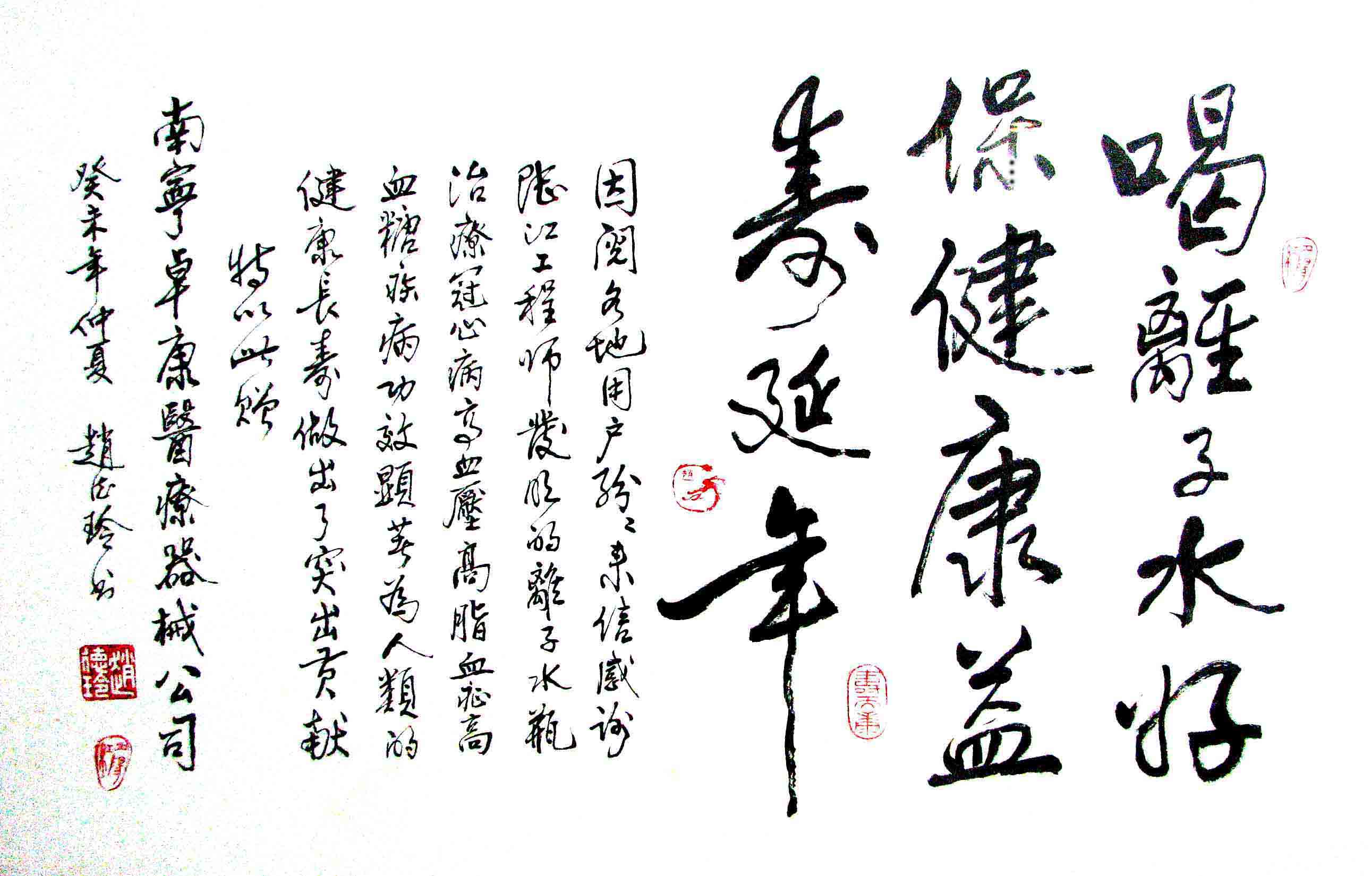 ---本品處理水用核磁共振測定值為55.82Hz(赫茲),為富含4-6個水分子小簇團的微小分子團水,可與世界各地長壽村水媲美。本品曾經(jīng)三家省級醫(yī)院做臨床觀察,經(jīng)北京和廣西醫(yī)學專家鑒定,22年來對以上病癥承諾療效,大量原發(fā)性高血壓患者飲用4至6個月內(nèi)停藥,血壓正常穩(wěn)定,癥狀消除,逐漸逆轉(zhuǎn)至消除動脈粥樣硬化;冠心病患者在3至5個月內(nèi)逐漸減輕至消除心痛胸悶,一年左右痊愈,心腦電圖正常。這是根據(jù)中國基礎(chǔ)醫(yī)學研究成果和生命科學原理轉(zhuǎn)化為醫(yī)學應用的杰出成果,使人從細胞到器官發(fā)展至全身健康。2型糖尿病患者使用3-10月內(nèi)痊愈。中風后遺癥患者7-10個月改善至消除肢體和語言障礙。用戶最新報告:尿毒癥患者飲用兩個月,指標已經(jīng)大為改善,適合腎衰和透析者使用。以上均為史無前例的轉(zhuǎn)化醫(yī)學應用,產(chǎn)品壽命30年,不換芯。